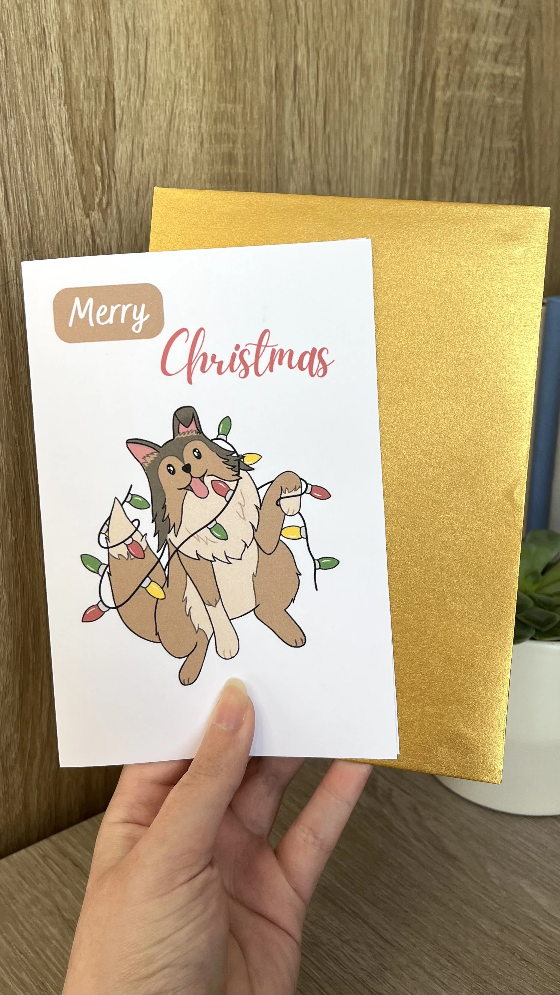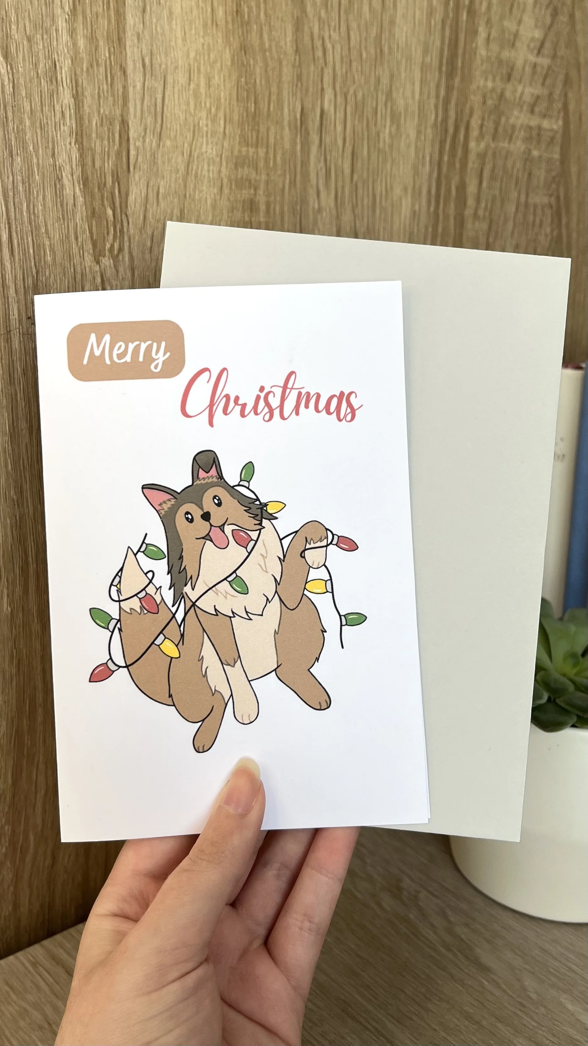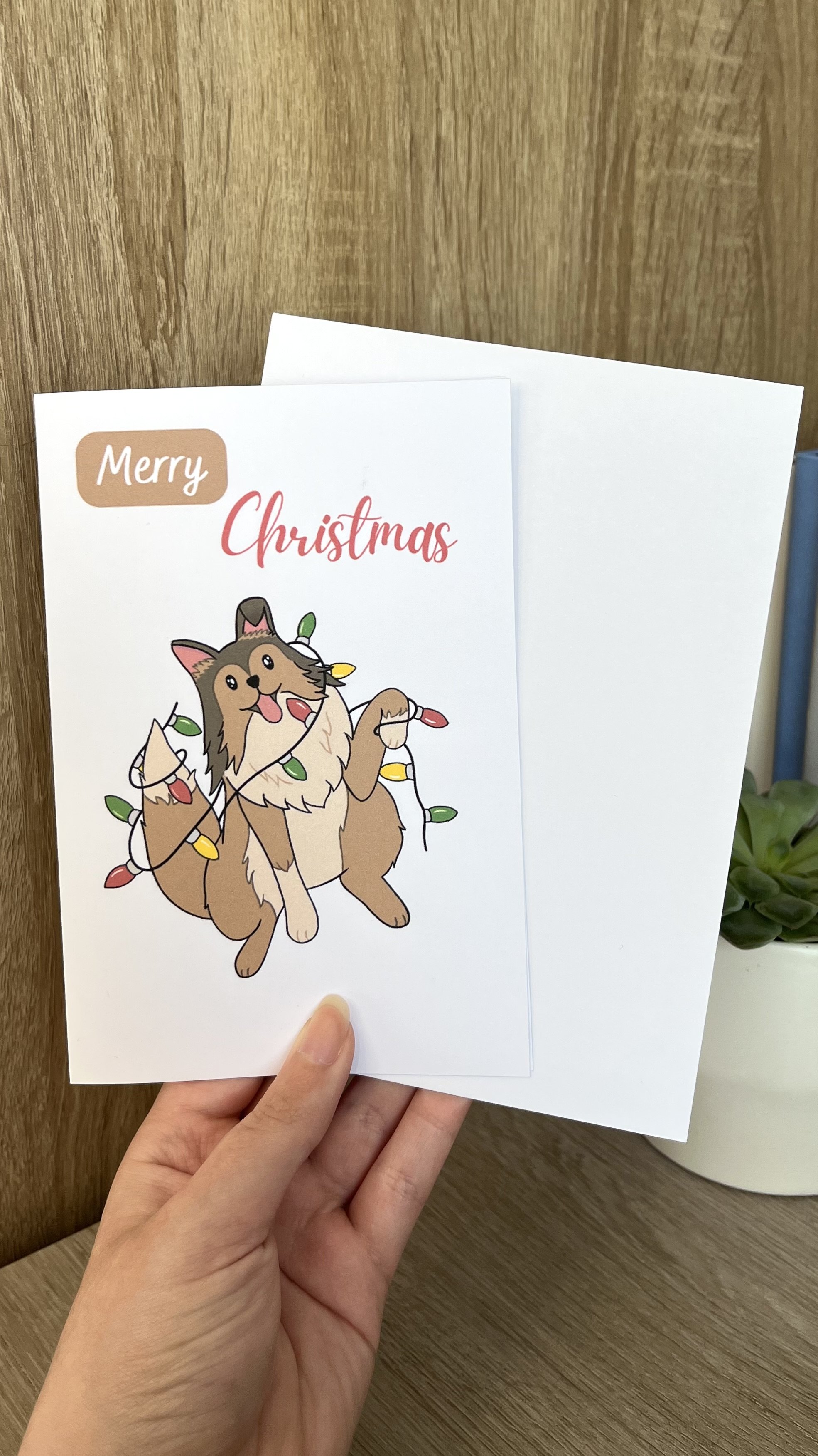 The perfect Christmas card for all the dog lovers in your life. And this card features my dog Skyla tangled in Christmas lights.